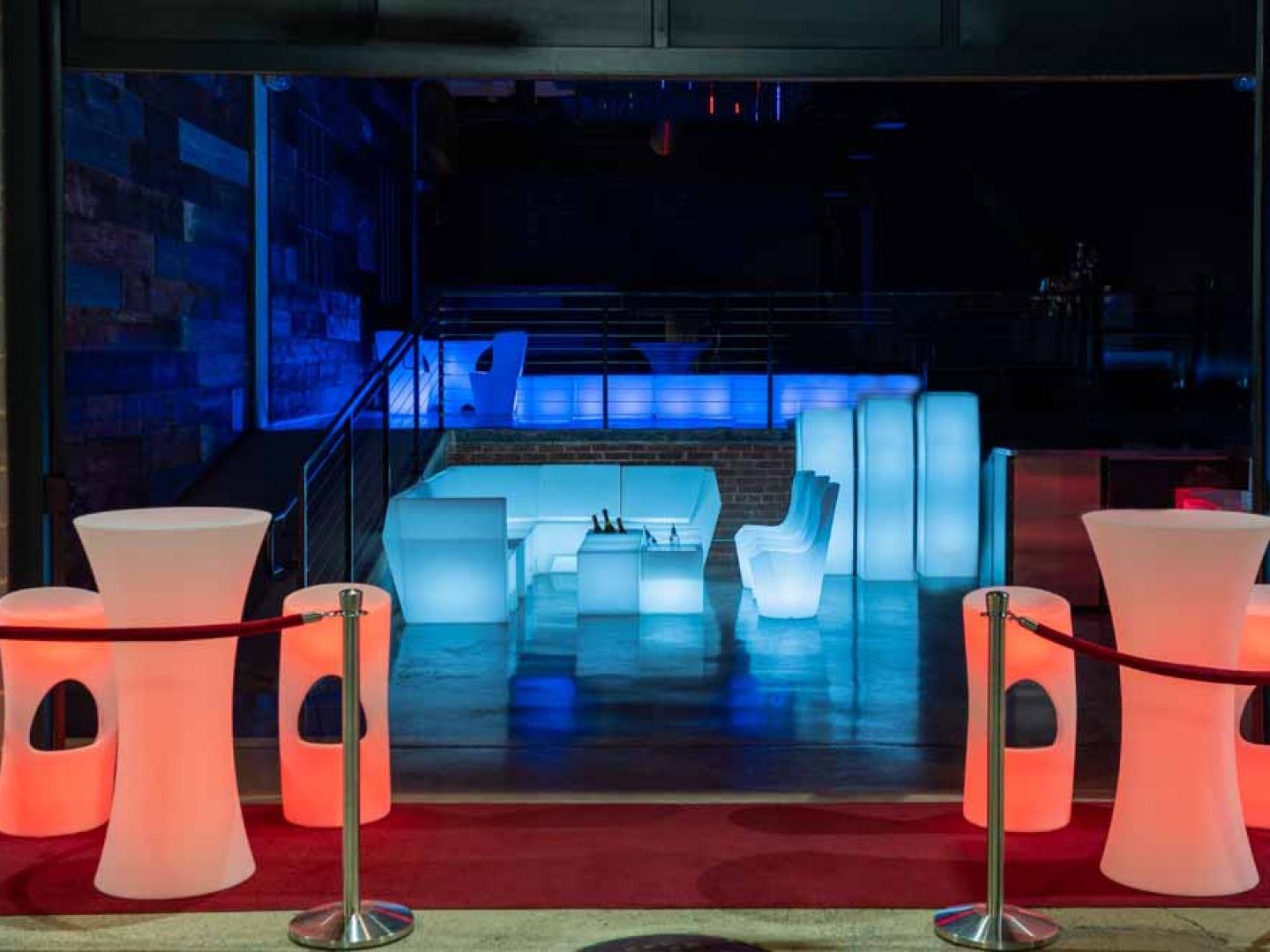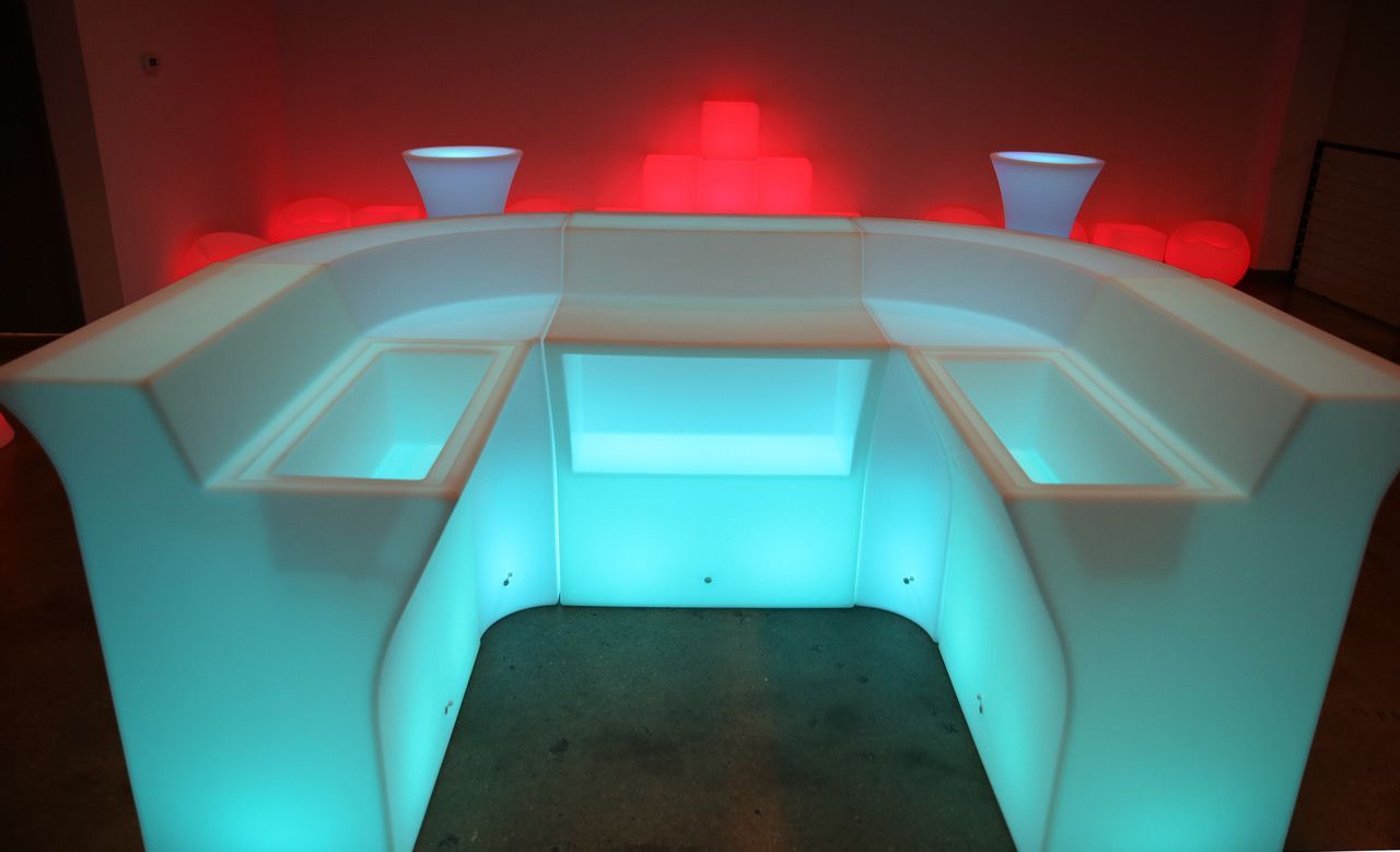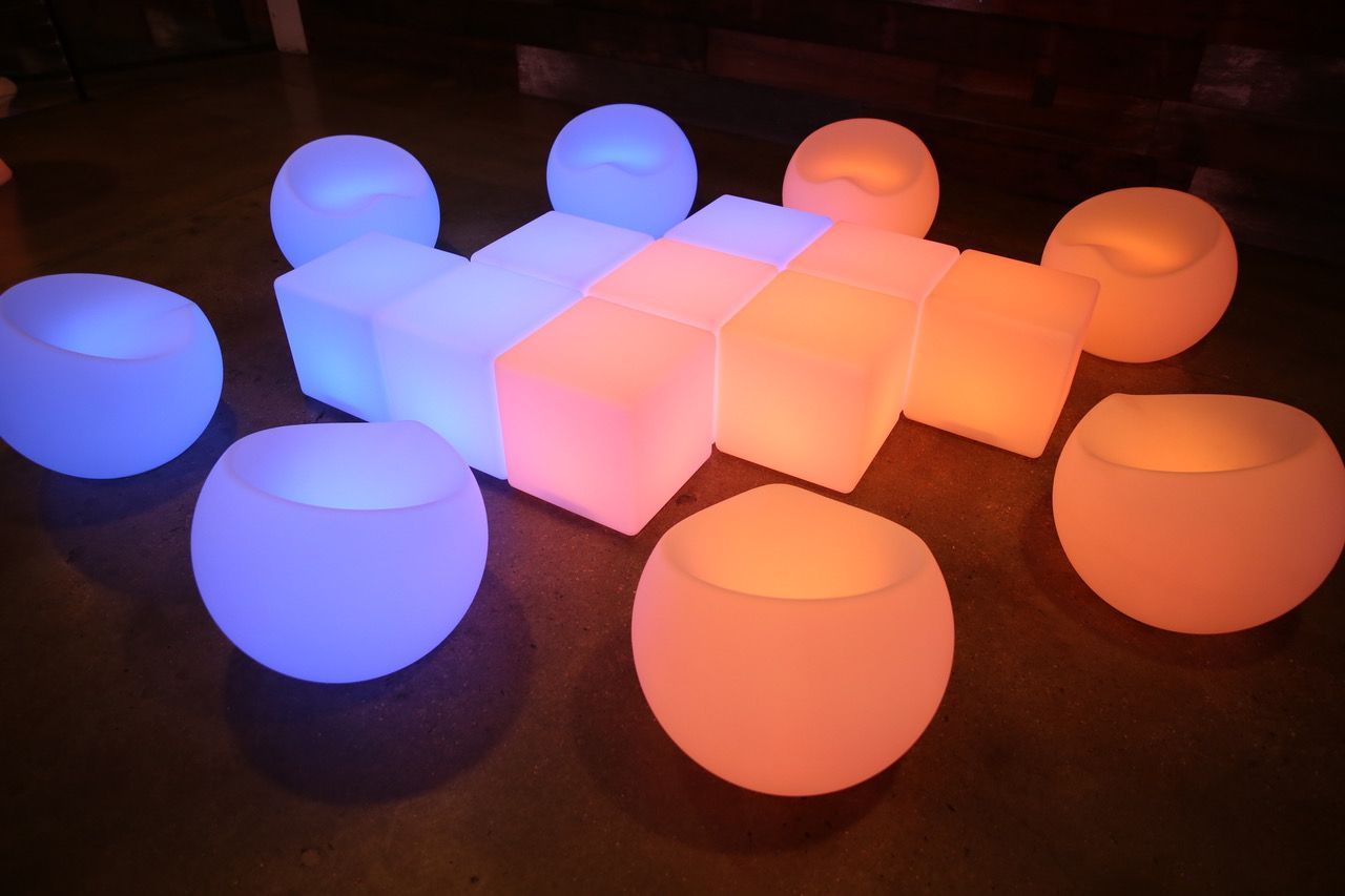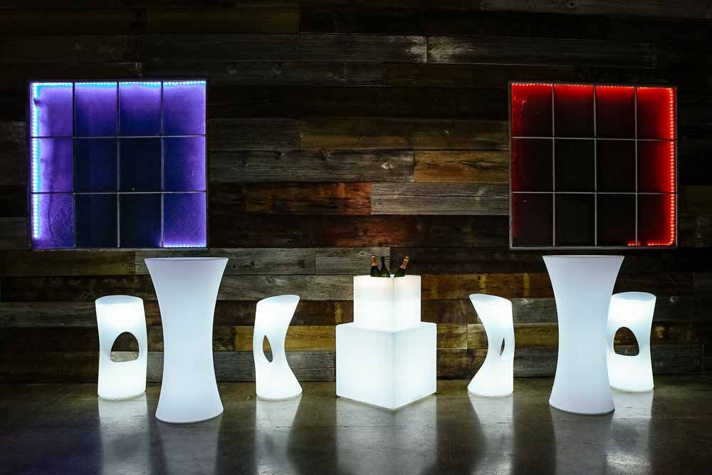 Light up the night and your affair with your own Glow LED Furniture Rentals. Can be set to 16 different colors and also fade and strobe. We can customize with your brand, logo or name lit up.